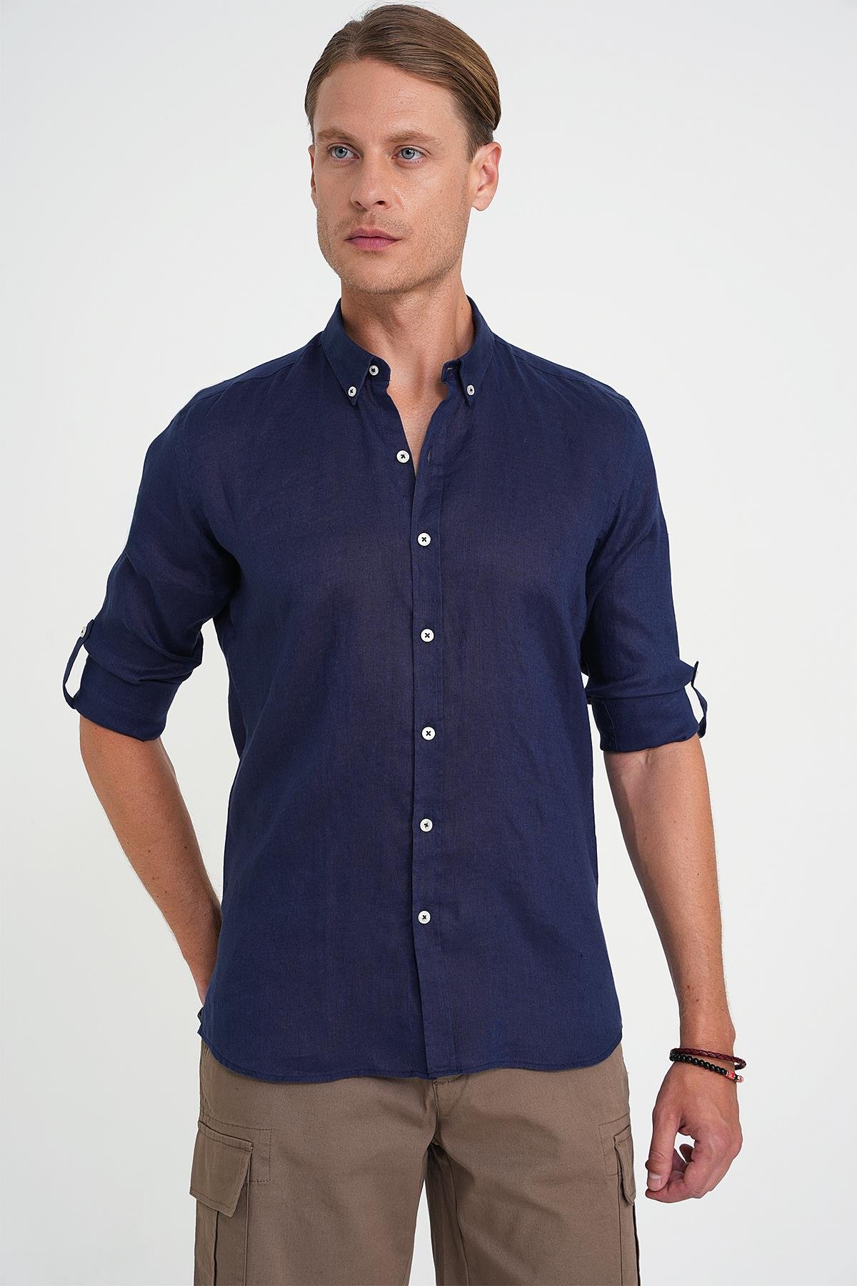 Comfort Fit Düğme Yaka Katlanır Kol %100 Keten Düz Lacivert Gömlek G 1595