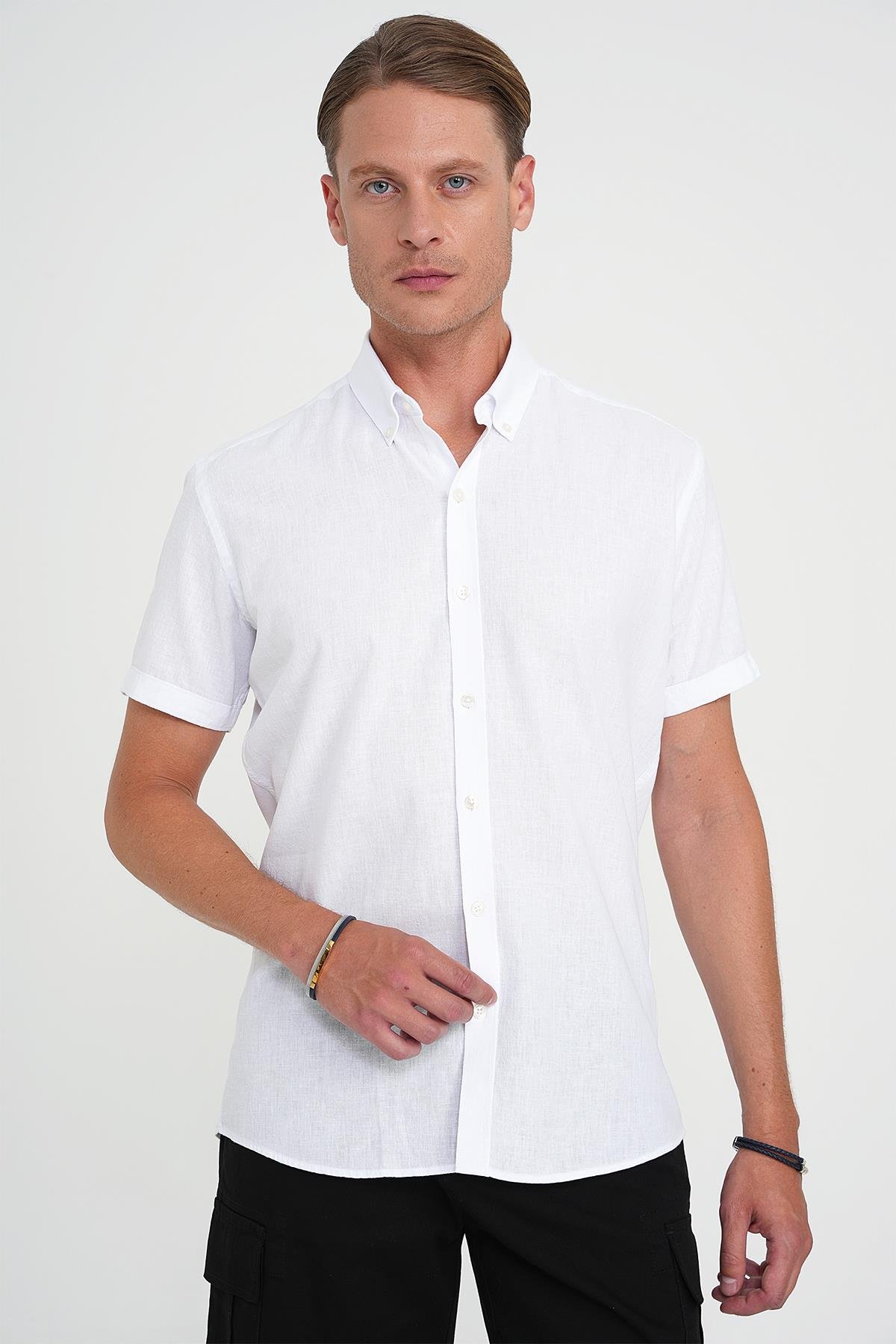 Comfort Fit Düğme Yaka Kısa Kol %100 Keten Düz Beyaz Gömlek G 1596 (G1596Y0425)