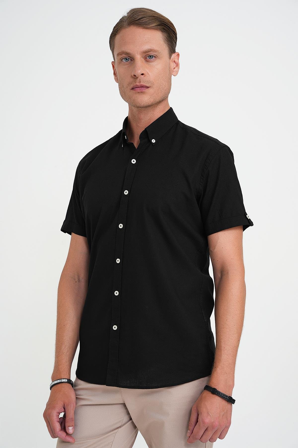Comfort Fit Düğme Yaka Kısa Kol %100 Keten Düz Siyah Gömlek G 1596 (G1596Y0425)