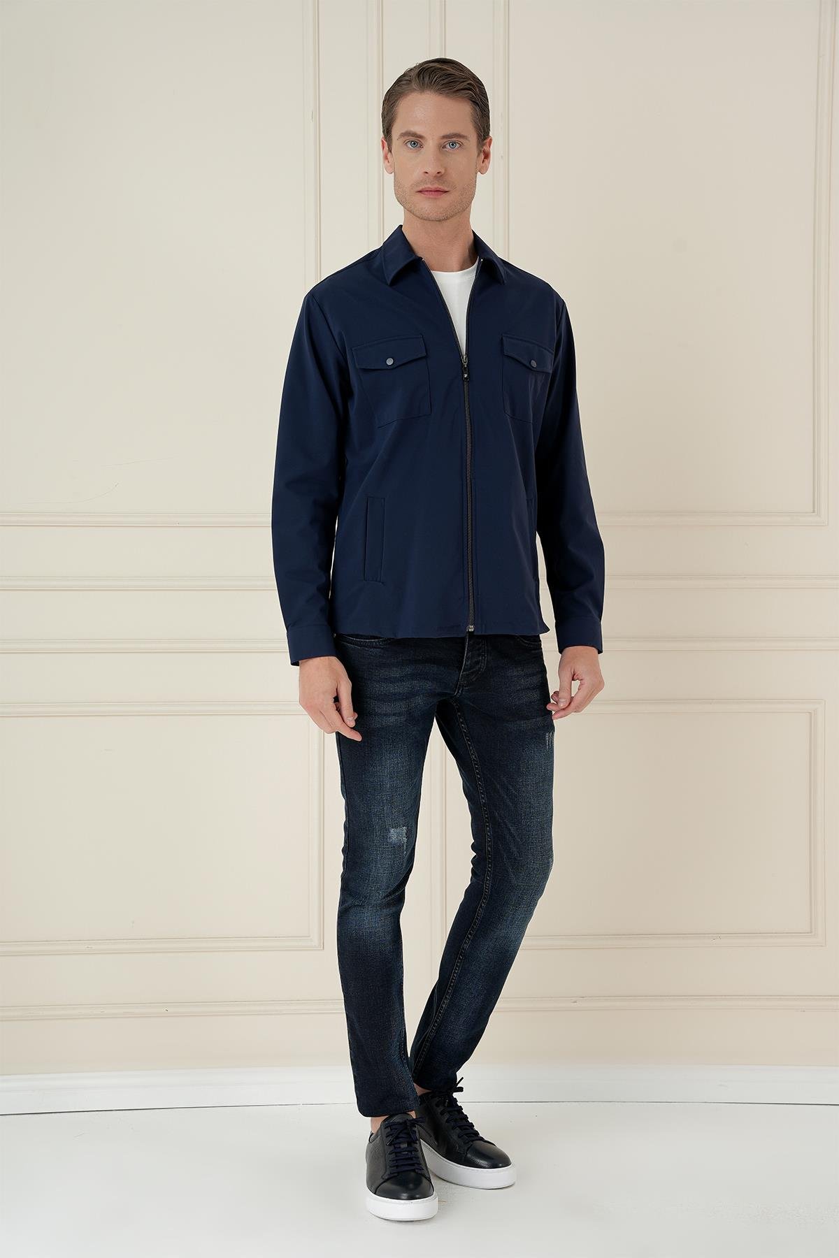 Önden Fermuarlı Yan Cepli Esnek Pamuk Lacivert Ceket Gömlek G 1582
