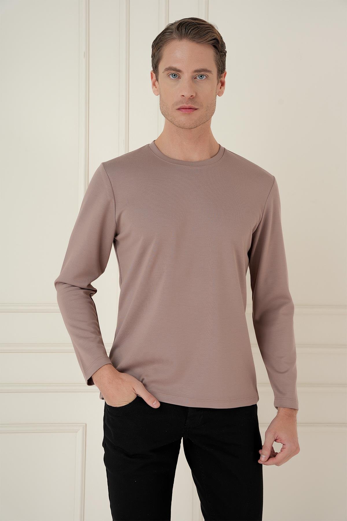 Comfort Fit Bisiklet Yaka Uzun Kol Casuel Vizon Tişört Ts 892